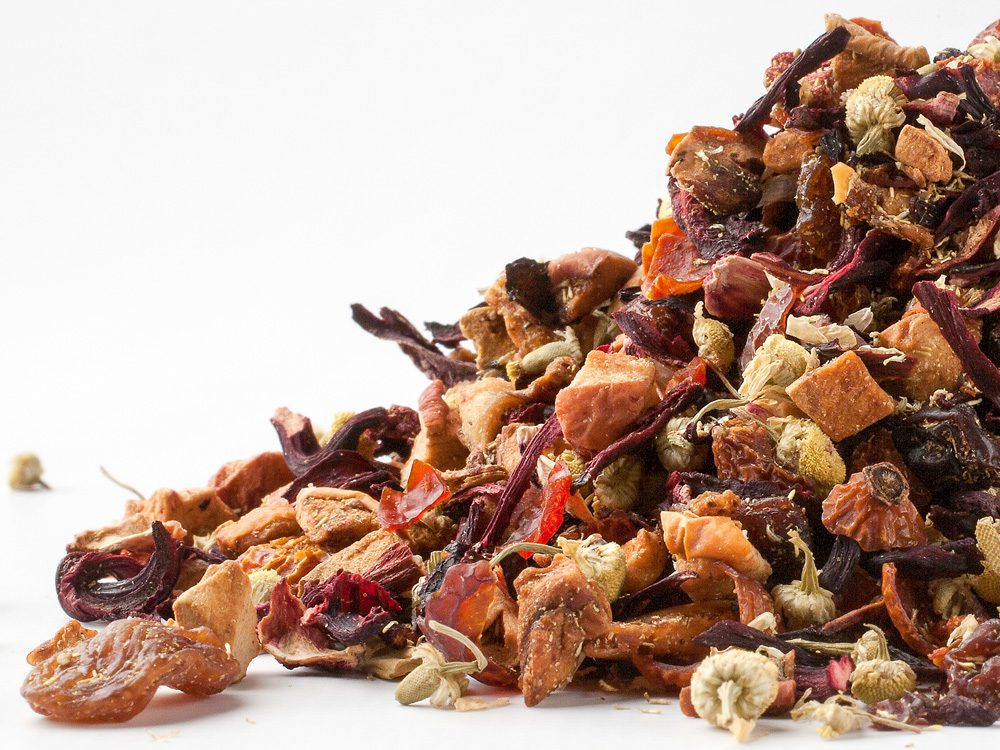 Opis Kúsky jabĺk, hrozno (hrozno, slnečnica), jahoda, ibištek, harmanček, svetlica, aróma. Bez kofeínu. Nutričné údaje na 100 ml: